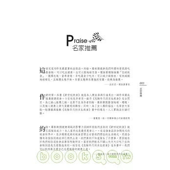 1.本書可以說是《新世紀飲食》的精采完結篇,如果你看過《新世紀飲食》,就絕對不能錯過《危險年代的求生飲食》。