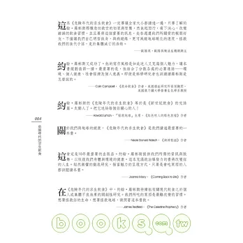 在這本石破天驚、極具說服力的《危險年代的求生飲食》中,約翰.羅彬斯以大量的研究報告&歷史事件,以及許多震撼人心、讓你哽咽落淚的真實故事,揭露錯誤飲食導致的危機。除了探討時下流行減肥法的真相,說明基因改造食物、狂牛症以及所吃食物對健康的影響外,羅彬斯更揭穿許多食品業者為隱瞞大眾而捏造的營養神話,和人類在飲食過程中所造成的悲劇;最後,他提供我們一個振奮人心的健康飲食新選擇,告訴我們如何延年益壽,增加生氣與活力,以及以更多同理心來維繫我們生存的世界。以下是你不知道或是不願面對的真相: