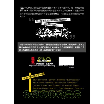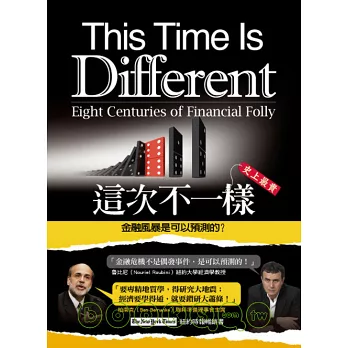 美國次貸風暴、歐洲債務危機衝擊全球金融市場,兩位知名經濟學家研究5大洲、66個國家&地區(包括台灣)800多年的國際金融危機史,從中世紀的貨幣流通問題到今天的各類金融危機發現,每每看似「空前絕後」的金融危機,其實不然,不論是已開發或開發中國家,各種金融風暴無論看起來是如何的「這次不一樣」,其實在其它國家或地區,還是其它時間都曾經發生過….有了類似的經驗與認知,可以讓金融體系更加完善,避免風險的產生,甚至在金融風暴產生時可以妥善因應、消彌災害。彭博(Bloomberg)評選金融危機年度十大好書,紐約時報暢銷書。