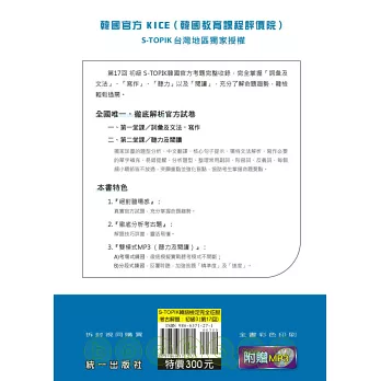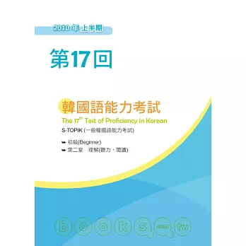 第17回 初級 S-TOPIK韓國官方考題完整收錄,完全掌握「詞彙及文法」、「寫作」、「聽力」以及「閱讀」,充分了解命題趨勢,韓檢輕鬆過關。