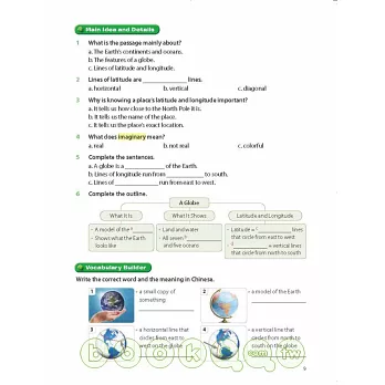 針對課文精心設計題型,練習閱讀理解技巧,包含找出文章的主旨(main idea)、細節(details)。另有圖解式大綱(outline)整理,協助掌握文章架構。