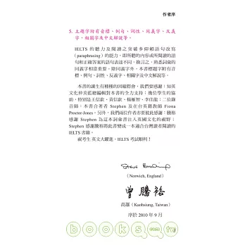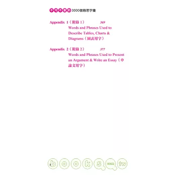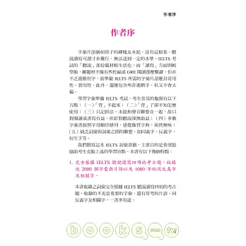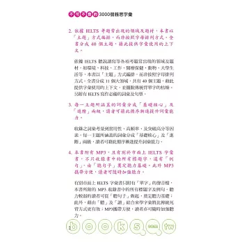 1.本書完全根據IELTS聽說讀寫四項的考古題,收錄2000個重要字彙與片語以及1000字的同反義字及相關字。