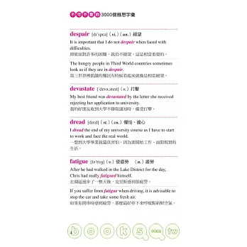 5.每一個主題字均附有音標、詞性、字義、例句與例句翻譯;豐富的同義字、反義字及相關字,更能積極幫助讀者擴大字彙量。