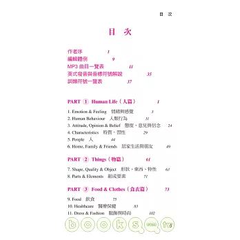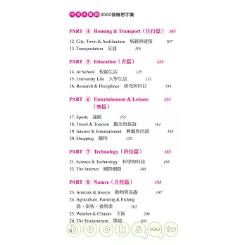 2.依據IELTS考題常出現的領域及題材,本書以「主題」方式編排,而非按照字母排列方式。全書分成40個主題,藉此提供字彙使用的上下文。