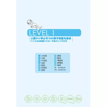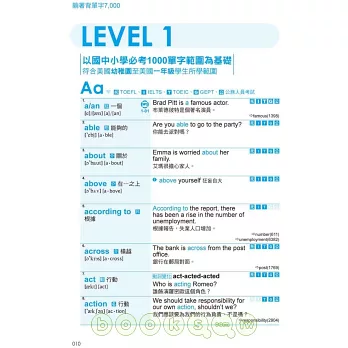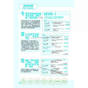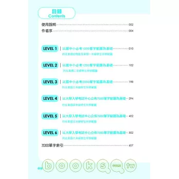 全書單字依照大考中心《高中英文參考詞彙表》分為6個LEVEL,並且比照美國學生學習程度,循序漸進的學習,輔以燈號標示,絕對適用於國中基測、大學學測、指定考試、GEPT、NEW TOEIC、留學考試(IELTS、TOEFL)、高普考等各類英文測驗。