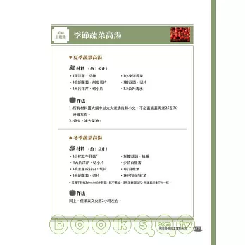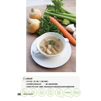 不過,必須強調的是,我非職業廚師,約柏非專業食物攝影師,因此圖片上的菜餚不見得有餐飲雜誌或烹飪書那麼「美」,但是它們都是真實的,完全未經加工(歐美的專業食物攝影為了效果,有在菜餚上噴蠟或其他化學物質的作法),是我這個愛做菜但廚藝不算太了不起的煮婦,按照書中食譜作法烹調而成,如果我做得出來,那麼大部分讀者只要分得清鹽和糖之區別,炒個青菜也還過得去,就應該也做得出來。如果讀者在烹調和享用這些菜色時,能配上我建議或自己偏愛的音樂,那敢情更好。相信我,那些美好的音符會滲透進入鍋中和碗碟上,讓家常食物變得不凡起來。
