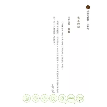 .書中更收錄星雲大師特別為本書而寫的《金剛經》四句偈「一切有為法,如夢幻泡影,如露亦如電,亦作如是觀」墨寶,珍貴難得。