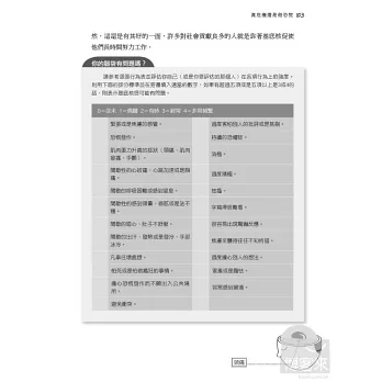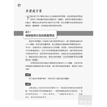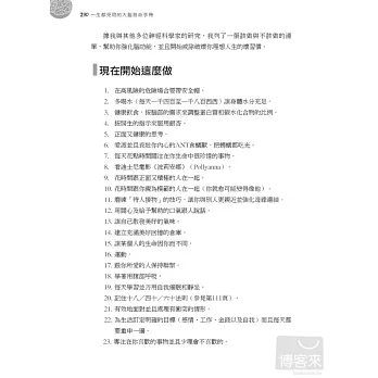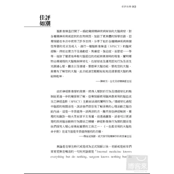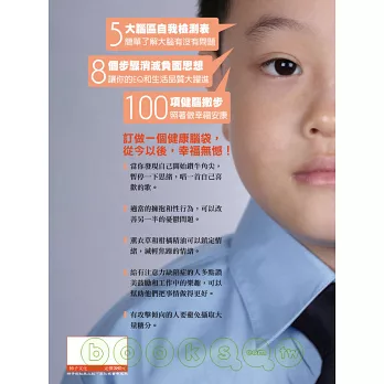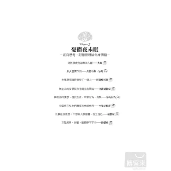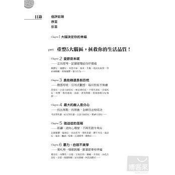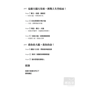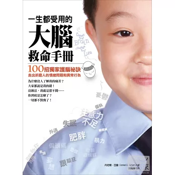 「全世界每4人就有1人,會在生命中經歷過精神健康問題!」這些現代人常有的情緒、精神困擾和疾病,有時會讓我們痛苦一輩子;《一生都受用的大腦救命手冊》除了深入簡出地讓你瞭解大腦五大區塊彼此的連結,和各種情緒精神問題的關係,也提供簡單又效果驚人的處方箋,包括心理調整、行為改變練習、芳療、飲食、運動、想像力療法、呼吸、冥想、自我催眠、藥物治療等,另外還有貼心的100項預防大腦問題產生的生活撇步,讓你大腦不生病,使身心更健康、做事更有效率,生命更幸福與成功。