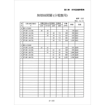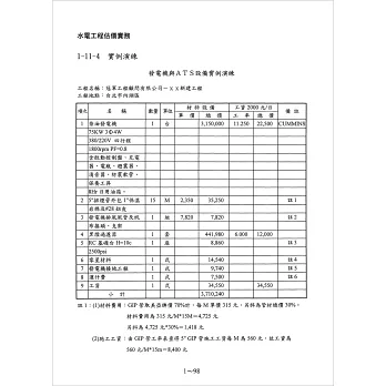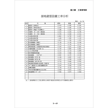 本書共分八大章,第一章至第四章分別介紹電氣、給排水、消防、假設工程之估價方法,從基本概念之引導,材料、設備、工資之計算,至實際案例之演練,均採循序漸進之方式,摒棄理論之繁瑣敘述,代之以簡介現行法規所應注意事項,讓讀者能一目瞭然。如已具備以上各工程之基礎,讀者可參照本書第五章,於統計數十個工地後所作出之成本分析表,在時間緊迫的狀況下,能迅速作成確實之預估;第六章則收錄當今營建工程界最使廣泛使用之材料設備牌價與參考單價,可大量節省讀者詢價之時間;第七、八章網羅國內各大廠商之聯絡電話,以及最實用之工率參考表供讀者查閱。