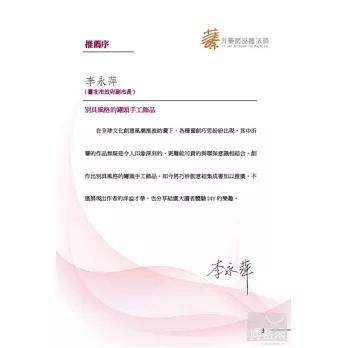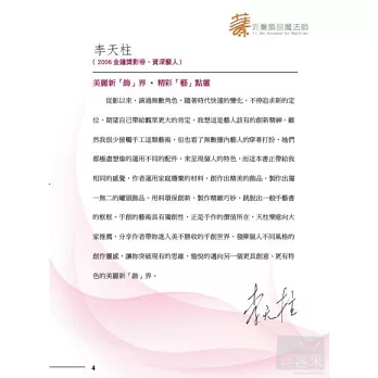 此書的技巧將為您帶來創作的無限驚奇,沂蓁能做到化腐朽為神奇般的精彩,您也可以做到,馬上試試,別猶豫喔!趕快來親自製作個性飾品,不論男生、女生都可以造出屬於自己的個性飾品,它將會是生日、母親節、情人節、兒童節、聖誕節等特別日子的最佳禮物,是一本值得收藏的工具書。