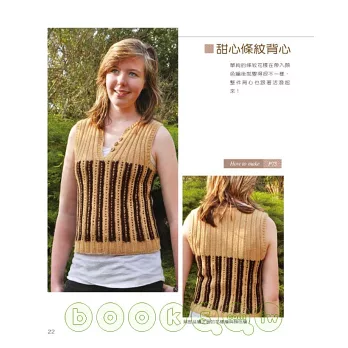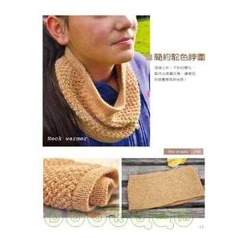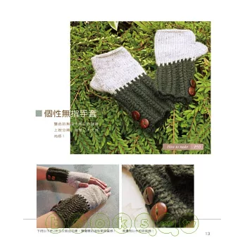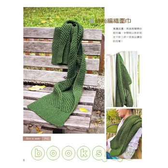 擁有自然系大地色彩與絕佳設計感作品的「就是愛編織」,終於亮麗登場了!本書包含作者的話、工具與材料、作品欣賞、編織說明、基本針法以及作品示範等單元,以詳細的文字解說為主,以編織圖格為輔,除了基本的平針、起伏針、鬆緊編外,更搭配了充滿變化與趣味的麻花編、纏繞針、繞線折返和交叉針等技法,充分表現於圍巾、帽子、手套、色筆袋、背心與長短袖毛衣之中,不管是優雅的、帥氣的、時尚的、浪漫的、中性的、簡約的、俏麗的或個性的,每件作品都是那麼吸引人,讓人想立刻動手製作。無論送給自己當作貼心好禮、送給情人表達甜蜜心意、送給家人傳遞溫暖祝福或送給朋友為他加油打氣,就讓我們透過雙手親自編織愛與溫暖吧!