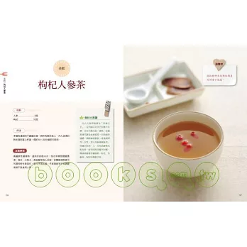 【茶飲】玫瑰蜂蜜茶100 / 枸杞人參茶102 / 橘皮茶104 / 參棗茶106 / 梅棗蜂蜜茶108 / 金桔水果茶110 / 老薑蜜茶112 / 益母草當歸紅棗茶114