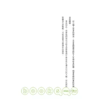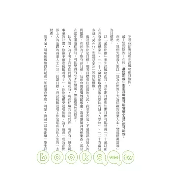 上班族如何不受景氣影響,收入提高、擁有職場競爭力?個人品牌的時代來臨,如何在競爭的環境中,讓自己與眾不同脫穎而出呢?想要爬上山頂不是只有一條路,你不需要受景氣影響!只要學會──從五項因素分析環境的「競爭戰略」;朝著沒人去過的汪洋大海出航的「藍海戰略」;透過「結盟」自我成長,站在世界最尖端的「平臺戰略」;運用「戰略性繞遠路職涯規劃」招喚機會……