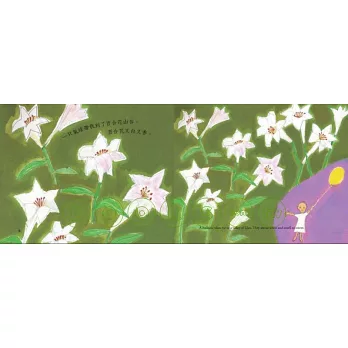 小百合在氣球的帶領下,一會兒穿梭百合花山谷,與笑笑的月亮相遇,一會兒滑下彩虹橋,看白鯨游來游去,還有穿很多層綠色裙子的包心菜,和成群的黃色蝴蝶飛舞。最後,小小的她落入大大張開的綠色葉子。喔!原來是爸爸媽媽溫暖的手掌。小百合的誕生旅程好長好長呀!