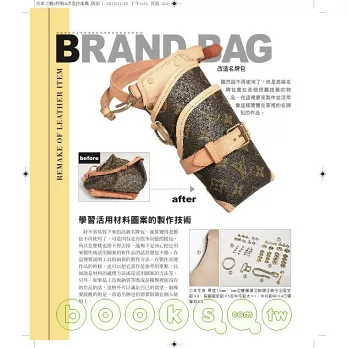 書中示範了使用裝飾用皮革、金屬零件等材料,讓原有皮件煥然一新的技巧,只要掌握其中的精髓,就能夠隨心變換造型與組合,讓皮件製品變得一點都不單調。