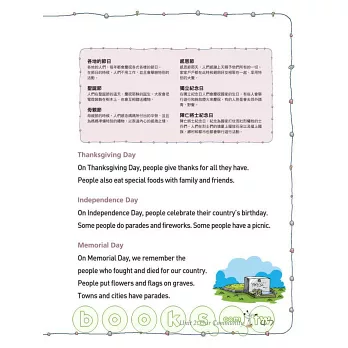 各國的節日、世界幣制、特殊的測量單位、羅馬數字……豐富英文交談內容。