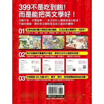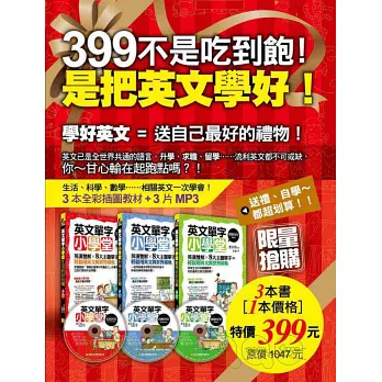 收錄生活、科學、數學數字相關的英文字彙,不僅實用且更具生活化,再依不同主題細分24大類:社區、公民、經濟、地理、歷史、生命科學、地球科學、物質科學、數數、估計、加減乘除、資料圖表、分數等等相關的生活字彙,一次學會!內容豐富多元,趣味十足且容易理解,利用單字間的關聯性,有系統、有效率的增加英文字彙!