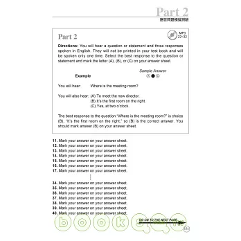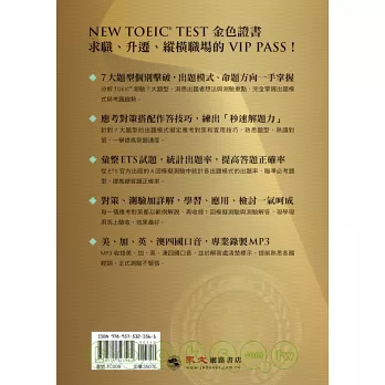 參加TOEIC測驗的考生最常反映的問題有二,一是聽力測驗聽過就忘,抓不到重點,一是閱讀測驗落落長,寫都寫不完。追根究底,原因出在「不熟悉出題模式」。出題者想考什麼?如何設計題目?如果能知道出題者的想法和出題模式,並事先針對測驗重點擬定應考對策,準備的時候就不會像無頭蒼蠅似的亂聽、亂讀、毫無章法。聽得有技巧,讀得有方法,看到選項就可以立即判斷出正確答案。