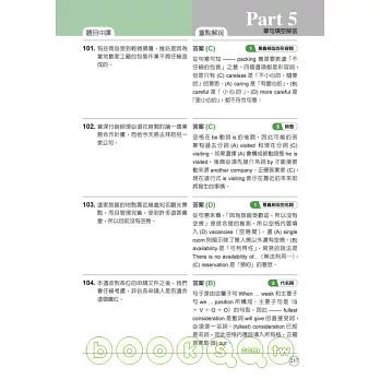 閱讀測驗共100題,測驗時間僅75分鐘,如何在規定時間內做完所有的題目?關鍵就在「時間分配」,而落實時間分配的重點正是「掌握出題模式」。Part 5, Part 6有70-80%的題目考的是「意義或拼字相似的字詞」和「詞性.時態.動詞型態」,因此,徹底弄懂這兩類出題模式的文法觀念,就能確實提高Part 5, Part 6的作答速度。而Part 7的題目和文章的結構有強烈的對應關係,只要熟悉Part 7五大類文章的鋪陳方式,再難的問題都能迎刃而解。