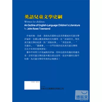 作者約翰.洛威.湯森(John Rowe Townsend)為英國著名且深具權威的兒童文學評論家,他以優美順暢的文句,不時帶入幽默的評論,讓讀者在了解過往歷史時不覺枯澀;在整個英美兒童文學史的介紹上,也能掌握大勢,針對重要作家作深入介紹,又不流於瑣碎,同時也提供有趣的周邊消息,使史料讀來更覺生動。此外,本書不忘對兒童文學的基本概念提出說明,格外適合非英語系國家的讀者了解英美兒童文學史。