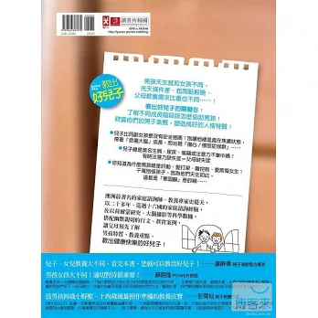 直到翻開了《教出好兒子》這本書,心裡的疑惑總算得以解答。這本書開宗明義就告訴我們:男生與女生,先天上就有截然不同的差異;不管在生理上、在大腦發育上、在心理上、或是在春青期發育階段上……皆是如此。原來,男孩子成長必須依照三個年齡階段,給予不同的關愛與協助才行;原來,男孩體內的睪固酮,是影響他們始終活蹦亂跳的原因;原來,男孩子比女孩子還缺乏溝通的能力……甚至有些男孩嚴重偏差行為的背後,其實是一種掩飾自己長期缺乏父親關愛的武裝。