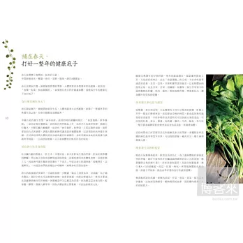 周老師在書中建議,春天的飲食宜多選辛、甘溫的食物,少酸澀。做法上則要清淡、忌油膩,為了補充陽氣,最好少吃生冷及刺激性食物。就算要進補,也要以輕補為主,像西洋蔘就比高麗蔘更適合用於春補。各類補湯中又以雞湯為首選,因為雞湯的營養豐富,可以補充元氣。