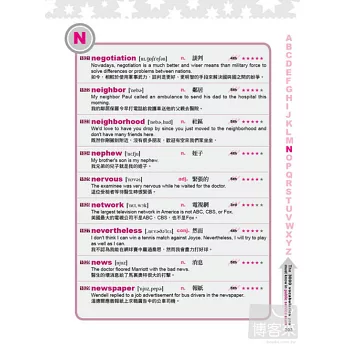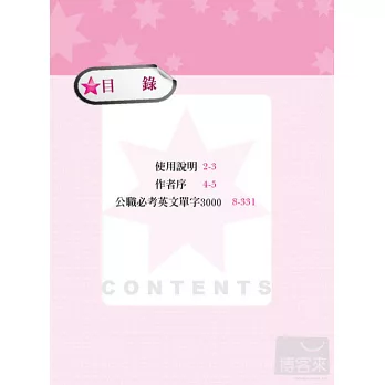 有鑑於此,作者仔細研讀歷屆公職英文試題,依據數據,精心挑選3000個高頻公職必考英單,以95-99年間為主軸,95年以前為輔,並以1-5顆星號標記出常考單字;同時,為因應升等考試,作者更費心整理出三職等、四職等、五職等考試中單字出現的頻率;此外,每一個單字所搭配的例句