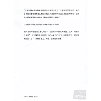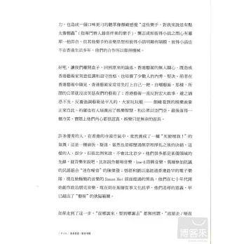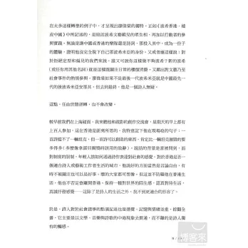「香港也有這麼一個波希米亞香港潛藏其中,如果你們不畏其神秘,大可投身進去,感受只有地道香港人和來港的冒險家們才能感受的火辣辣快感。而且順藤摸瓜,你得以透視一個城市真正的脈絡……她 是怎樣贏得她挑剔的情人的心的?」 以上的話,如果出自曾旅居兩岸三地的廖偉棠之口,你會否訝異?香港原來竟有這麼一面吸引他,使他親身感悟過中國的嬉皮生活後,暫作停留,以漂流的狀態,寫出當中的差異和對比,更以一貫銳利沉鬱的眼晴,拍下了香港此時彼刻的人面和文化景象。讀畢此書你會發現,其實是文學、是音樂、是劇場、是抗爭,以及當中的情愫等等,刻劃出一個城市深刻的輪廓。