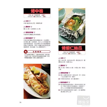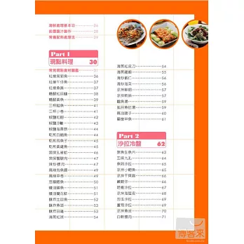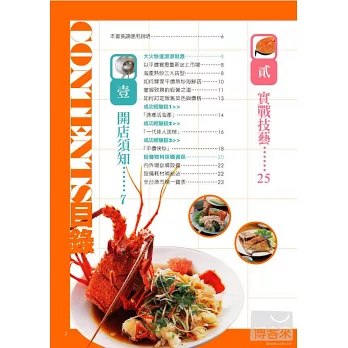要料理出熱炒海鮮店的百樣菜色,學會正確的處理海鮮是首要之務,而料理的靈魂--「醬汁」,更是掌握口味的重要寶物,因此書中特別另闢單元,傳授海鮮處理及醬汁調配的實戰技藝。在食譜菜色的分類上,依照店家常用菜單格式,歸類為「現點、沙拉冷盤、火烤&三杯&鐵板、熱炒、麵飯湯品」五大類,每道食譜均附有「材料成本」、「建議售價」、「銷售毛利」、「營業前準備」、「點菜後製作」的行家叮嚀,另外還有「生財秘訣」及「延伸菜單」,讓大家在參考搜尋時更方便實用,操作起來也更得心應手。