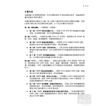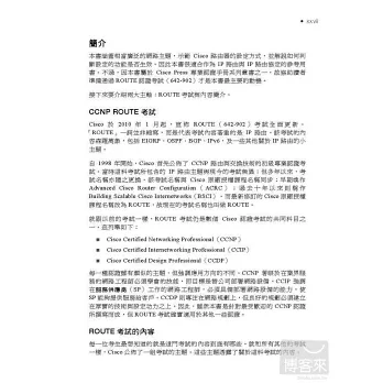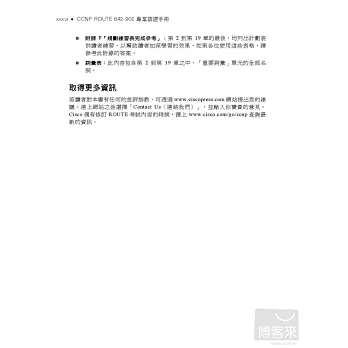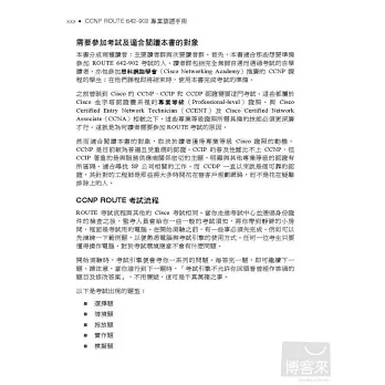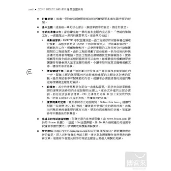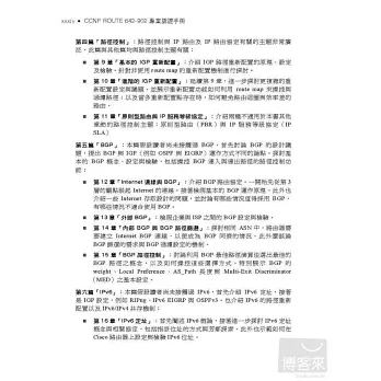 《CCNP ROUTE 642-902專業認證手冊》是Cisco官方推薦的學習教材之一,涵蓋了來自Cisco Press授權的Cisco培訓夥伴與自學產品之模擬試題及紮實的訓練;若需更多關於世界各地Cisco授權培訓夥伴所提供的講師授課訓練、e-學習、以及務實的教學,請參閱網址www.cisco.com/go/authorizedtraining