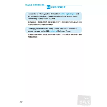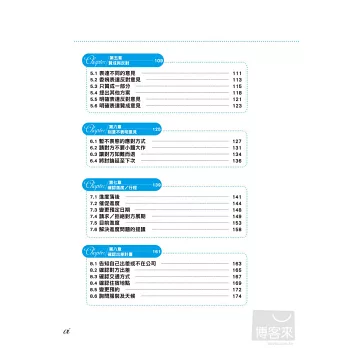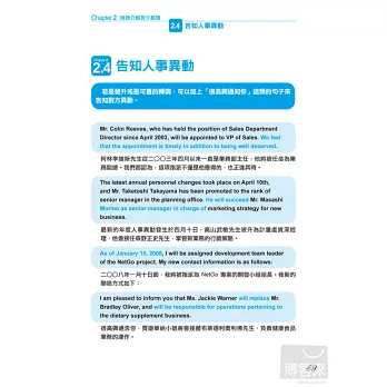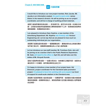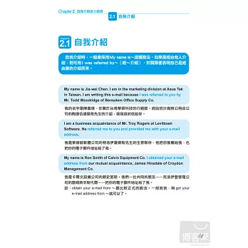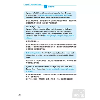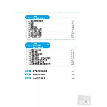 本書作者擁有數學語言學博士的專業背景,以科學化的方式過濾大量商業書信,精準的歸納出,包括「商業會晤」、「刻意不表明意見」、「贊成與反對」、「確認進度和行程」…等國際商務人士最常使用的10大類英文e-mail使用情境。