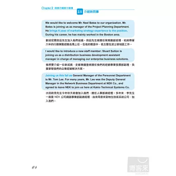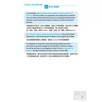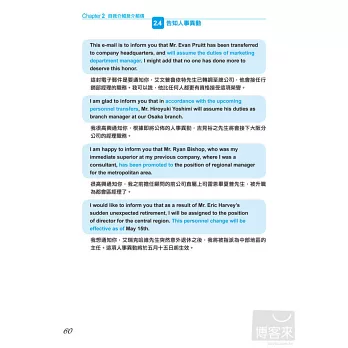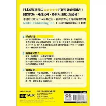 在十大類e-mail使用情境之下,全書共收錄1000句以上的完整示範句型。並且獨創「換句話說」的超多範例,不論想要表達什麼意思,都能在本書收錄的句型裡逐一挑選。