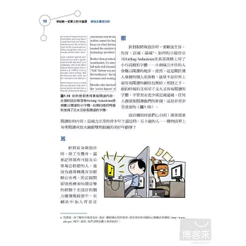 這門學問所講述的知識,幾乎都跟「找東西」有關——唯有讓使用者順利找到他要的東西,你的網站才有價值,也才有獲利的契機。本書是資訊架構的入門磚,介紹其核心概念:如何組織網站內容使其可被尋得、如何設計網站互動使其適於利用、如何創造介面使其易於理解。全書例舉超過180筆個案研究,搭配全彩圖片和插畫,涵蓋搜尋範圍、可尋性、標籤、通俗分類學等議題。如果你已經熟悉網頁可用性、網頁親和力、互動設計、社群經營等領域,你會發現腦中的知識,將在閱讀此書時被點醒,更能融會貫通。