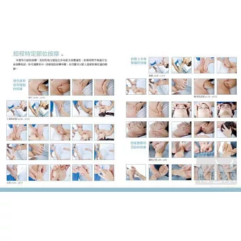 本書的最後亦提供一系列的按摩步驟方案,例如「適合經常使用電腦的按摩」、「放鬆上半身緊蹦的按摩」等等,方便在沒有足夠的時間進行全身按摩時,可靈活運用。