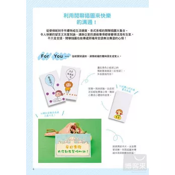 本書作者強調,不需要高超的技巧也能享受畫畫的樂趣,更進一步的還可以將它應用在生活的留言,或是便利貼之上。親朋好友的生日卡片可以自己設計,親筆描繪自己與對方的肖像,心意滿點!考試前想借筆記抄,就畫一張可憐兮兮的表情,加上「拜託啦~ 」的對話框,任誰都無法拒絕。不論是上課偷傳的小紙條、媽媽給孩子的留言、附在禮物中的小卡……只要加上小插圖,生活將會多出許多驚喜與歡樂!