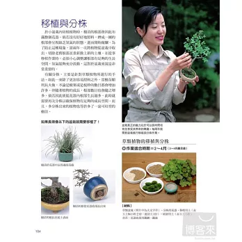 ★另設「香織的盆栽筆記」與「專欄」,解說盆栽移植、裝飾技巧、花盆選擇、澆花技巧等基本功夫,就算是從未涉獵盆栽者,也能輕鬆上手。