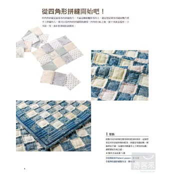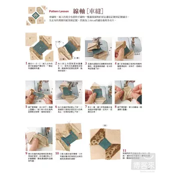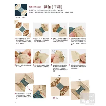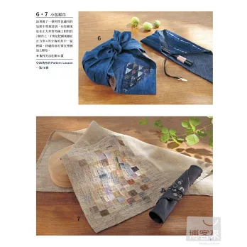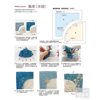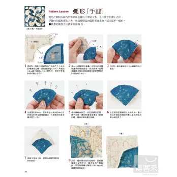 20 壁飾在中心布片的周圍逐步縫合布條的瘋狂小木屋圖案是專屬於縫紉機的技巧。先拼縫許多稍微改變配色的區塊,再以不規則的配置排列這些區塊,這樣才有瘋狂拼布的樂趣。飾邊用2支針縫的裝飾褶增加立體感。製作方法在第75頁瘋狂小木屋的Pattern Lesson…第36頁用裝飾褶的壓線…第37頁直角包邊的縫製方法…第63頁Pattern Lesson弧形[手縫]弧形之間相互縫合的要領就是縫份不要留太多,也不要忘記畫上合印。手縫時凸弧形要在上方,車縫時則是凹弧形要在上方,縫法是不一樣的。