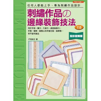 任何人都能快速上手、專為刺繡作品設計的飾邊製作指南,一共有115種花樣,怎麼做也做不膩!以往在裝飾大桌巾或桌面裝飾巾等平面布製品的邊緣時,多半是使用鉤針編織的緣編,但有不少人覺得這種方法既花時間又麻煩。因此,本書改採基本的裱褙法、變化型裱褙法和三摺處理法的裝飾方式,此外,也可以利用布條、流蘇、刺繡等作裝飾。
