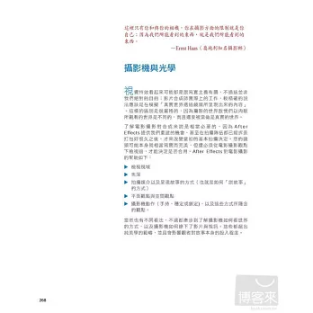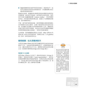 ● 合成影片的基礎學習:無論特效多麼精美,其實都是由像素像積木般一格格堆疊起來的,本書幫您補強影片或其他高階影片格式製作裡,所需具備的顏色、光線、去背、動作追蹤、繪圖式轉描...等基本功。