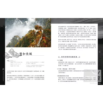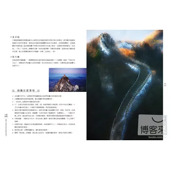 本書精選約40餘個北京旅遊拍攝景點,涵蓋地點全面,題材分類詳盡,圖片搭配精美,技法講述實用,是一本可以隨時翻看並能從中有所收穫的旅遊攝影書。內容依照「皇家風範」、「長城內外」、「胡同陰影」等題材分為7大類,每個類別裡的地點都精挑細選,提供常年生活在北京,以及來自各地前往北京旅遊的旅人們更深入且實用的參考。