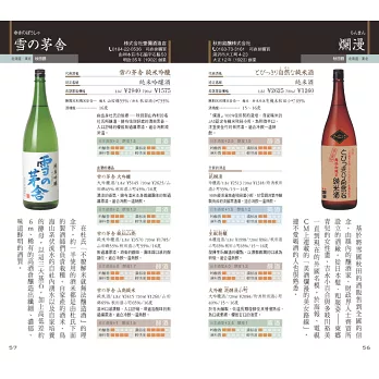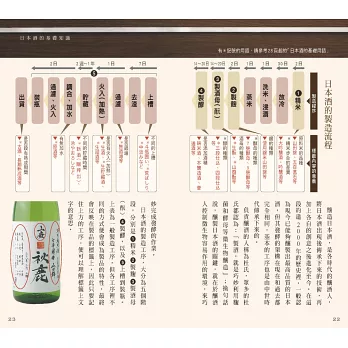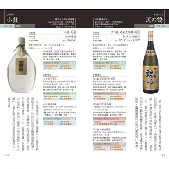 這是一本為方便選擇日本酒和想飲用日本酒的人所編輯的指南書,全書將每個酒廠的代表、推薦酒品,詳細地將酒質以香氣、濃郁度、輕快度來區分圖示,也一併記載味道的特徵和最適口的溫度等,可以完全了解日本酒的全貌。全書196個知名與具代表的酒商品牌、超過750款以上的日本酒款,您可以作為挑選合乎自己口味日本酒的參考,想要飲用的日本酒也可以立刻找到。