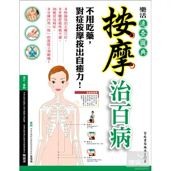 《按摩治百病》書中,詳細介紹中式按摩的手法技巧、身體各部位的穴位與反射區,以及常見病的對症按摩法,並以全彩步驟圖解的方式呈現,按圖索驥,是最適合初學中式按摩入門者的按摩書。