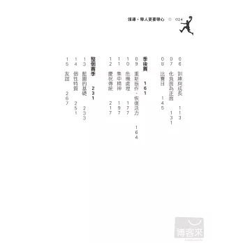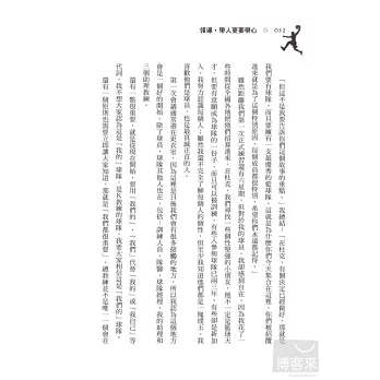 本書內容是K教練透過帶領球隊的經驗,與讀者分享他的領導哲學。企業組織跟球隊一樣,都處在競賽(競爭)環境,除了事前的萬全準備,更要因應環境變化隨時作出調整,才能順利達成目標。領導者面對的不只是冷冰冰的績效數字,更重要的是引領部屬朝共同目標前進,當成員向心力強,作出共同承諾,有著良好關係,並團結一致,目標自然水到渠成,這個過程中,領導者扮演了關鍵角色。