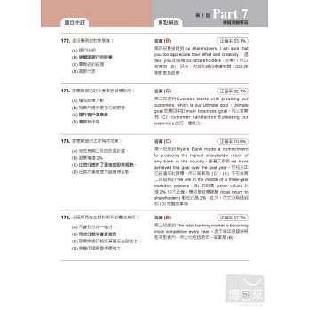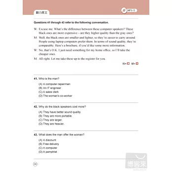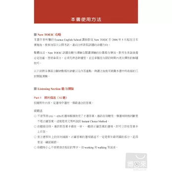 針對每道題目分析答題重點、說明正誤選項,對於考生易犯錯的同義字、同音字等做詳盡解說,訓練考生熟悉New TOEIC測驗出題特性,避免犯錯失分。