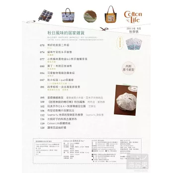 美麗的紅楓飄香,淡雅而寧靜的手作時刻,午後的日光緩緩地、悠悠地進入秋天的夢境。剪下一片片的小布塊,拿起針線細膩縫著,輕載心底的無數情懷,用拼布手藝來典藏這個季節的幸福生活。本期《Cotton Life玩布生活》為讀者帶來許多具有特色的秋季主題,以及有趣的拼布活動,讓喜愛布作的玩家們一同感受秋天的手作詩意。