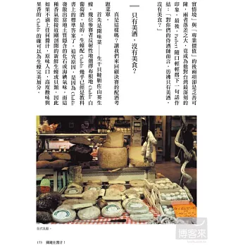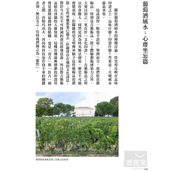 這就是我對這本書的解釋:並非「且樂生前一杯酒,何須身後千載名」的無羈瀟灑,而是不惑之年藉由葡萄酒所引發的苦心思索、深刻聯想,以及一斧一鑿沉吟創作的產物。讀者可能會發現,我對於葡萄酒的欣賞與熱愛似乎已經超越葡萄酒本身。是的,對我而言,葡萄酒不僅止於顏色、氣味與口感、餘韻,更與地點、人群、文化、環境、宇宙時空息息相關,與我過去所學習的人文、歷史、地理、生物、物理、化學、工程……,乃至於哲學等知識緊密相繫;甚至,在品味與思考的過程中,恍惚之間,我曾經瞥見自己在無垠宇宙時空之中的明確座標。