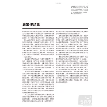 本書作者來自英國深厚設計文化和高階設計水平的背景,不只提供歐洲正規作品集製作的實務觀念,也是台灣設計界對作品集的概念、本質、功能、類型等難得的全面性探索機會;書中許多歐、美、澳專業設計人士對作品集的肯切看法,也提供國內設計新鮮人製作作品集時,一個多面相的實務參考資料。