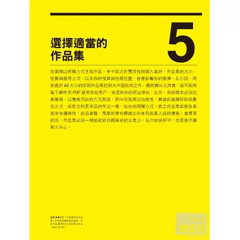 現在網路方便,挑幾個新潮樣式來模仿很容易,學幾招做秀式的表現手法也不難,但如何從表象的作品集技巧操弄,提昇到實質的作品集觀念認知,就不那麼輕鬆如意了。本書作者一開始就強調,這不是一本拉著你的手做剪貼裁接的「技術」手冊,而是教你用腦筋思考的「觀念」書本;看完整本書之後,我發現這也不是一本教你表演做秀的「求職」祕籍,而是教你用心體會和用力經營的「規則」書本。有觀念又懂規則,做出來的作品集才會言之有物,一個設計人的專業實力才可以據實呈現。
