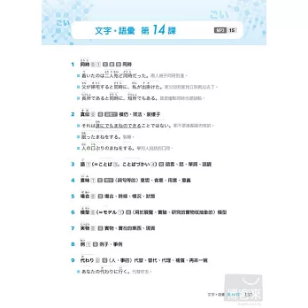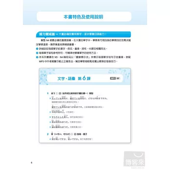 彙整N4級數必備的重要語彙,學習者可視自身的學習目的及需求擬定學習進度,循序漸進地累積語彙量。