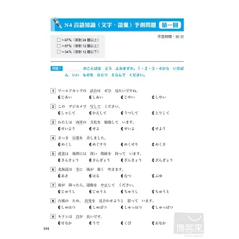 新日檢N4題型剖析及應試準備技巧無私公開,五回「予測問題」完全擬真,幫助學習者熟悉新日檢考試型態、提升應試準備能力,並確實驗收學習成效。